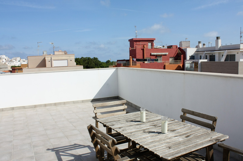 - Terraza con vistas a la playa y al castillo, equipada con mesa y sillas, toldo y tumbona.