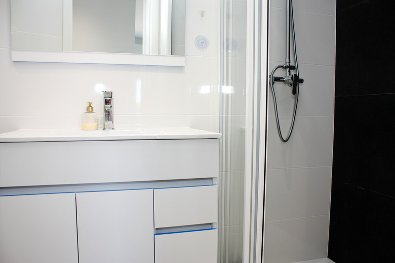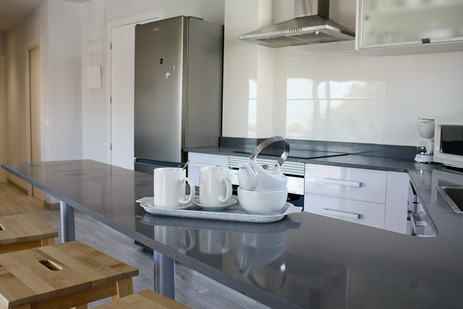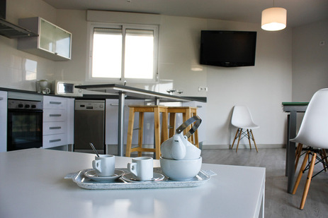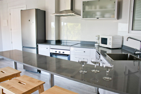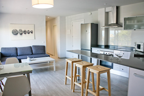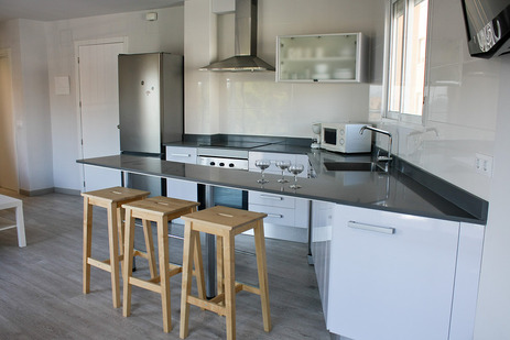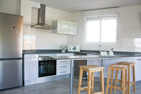 - cocina abierta equipada, con lavavajillas y barra americana con tres taburetes
